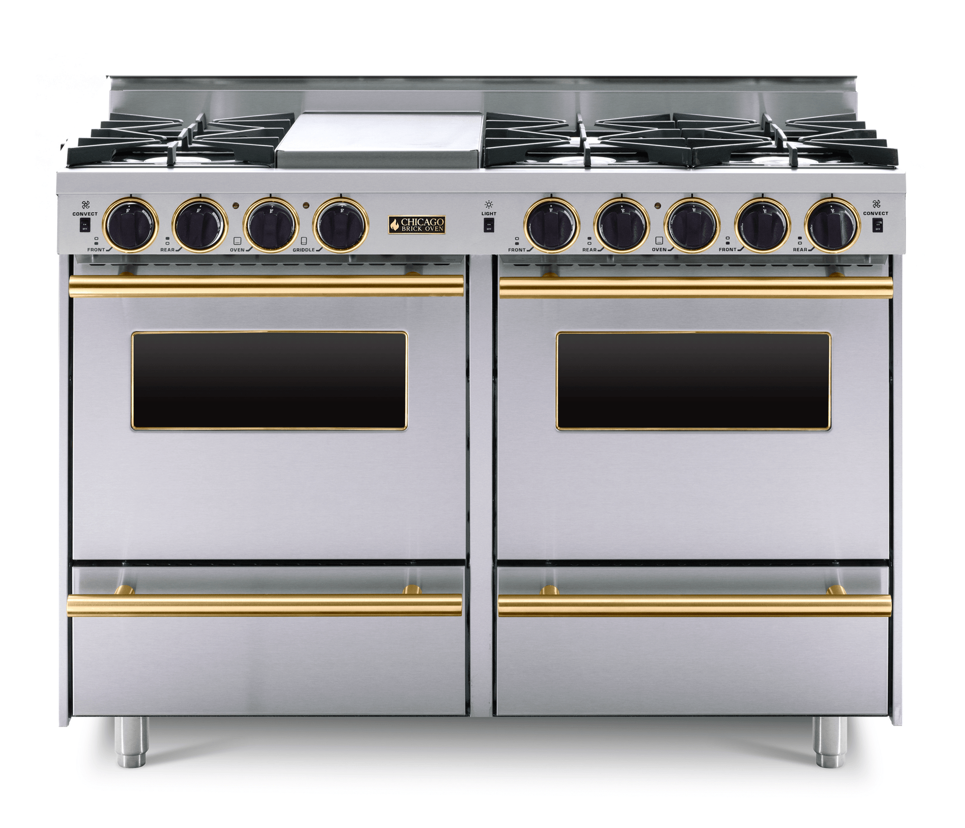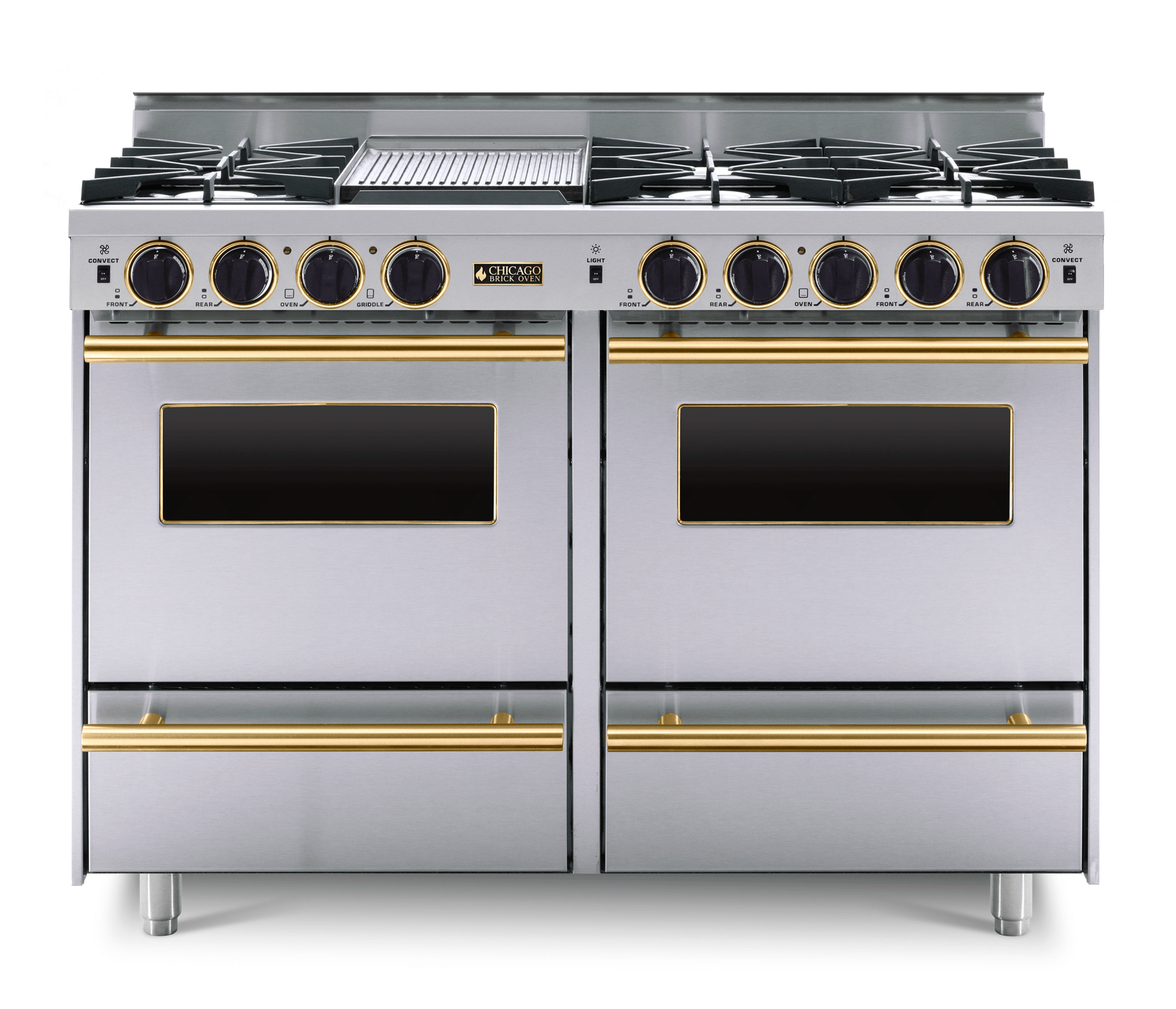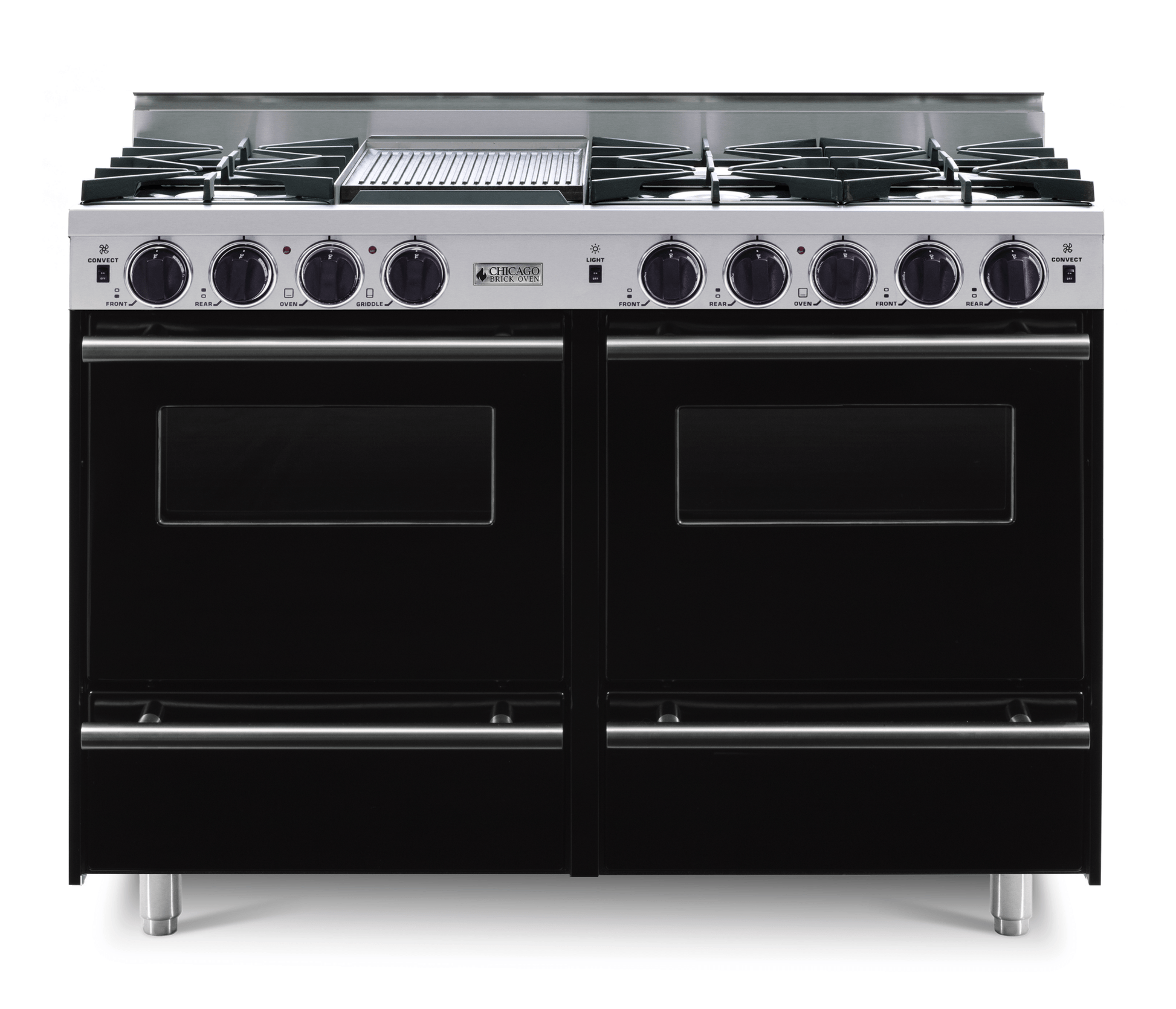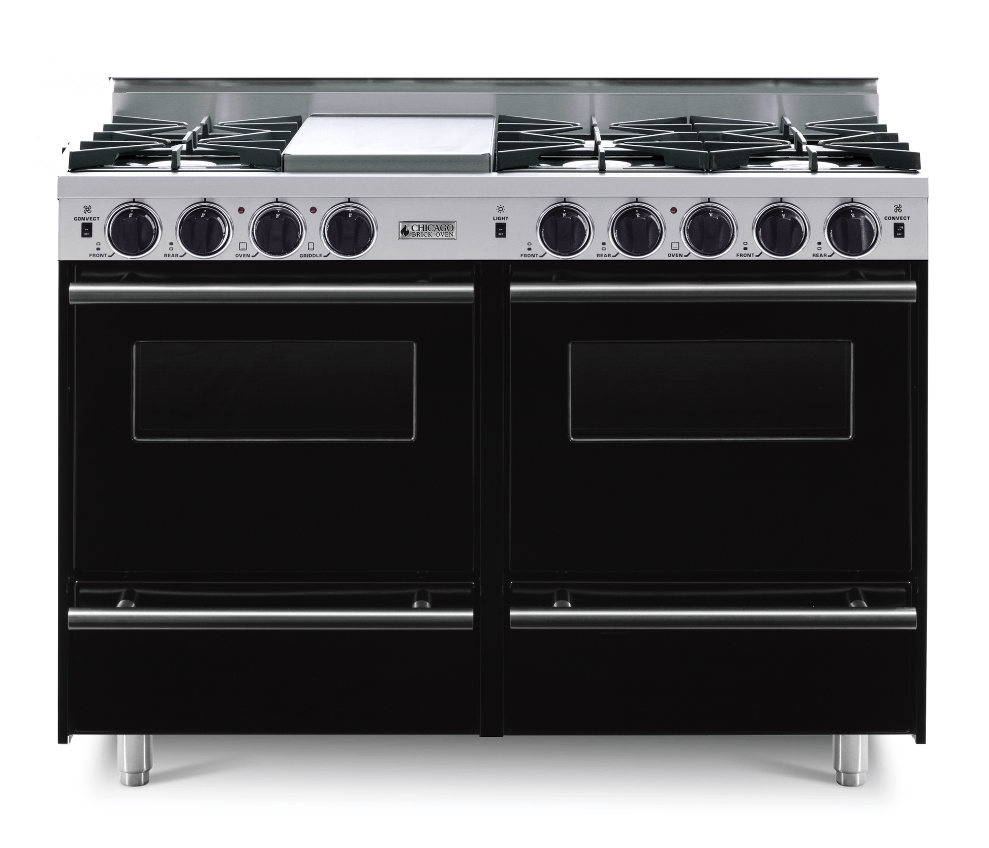Upgrade your cooking game with this 48" All-Gas Range featuring six open burners—three with an exclusive “Vari-Flame™” simmer down to 400 BTU, plus “click” settings up to 14,000 BTU for powerful searing. Two 19" wide ovens (each 2.92 cu. ft.) include an 18,000 BTU broiler, while a flip-over cast iron griddle/grill expands your menu possibilities. Complete with pilotless electronic ignition, commercial-style doors, large viewing windows, continuous cast iron grates, and a stainless-steel griddle cover, this range delivers professional performance and exceptional versatility for all your cooking adventures.